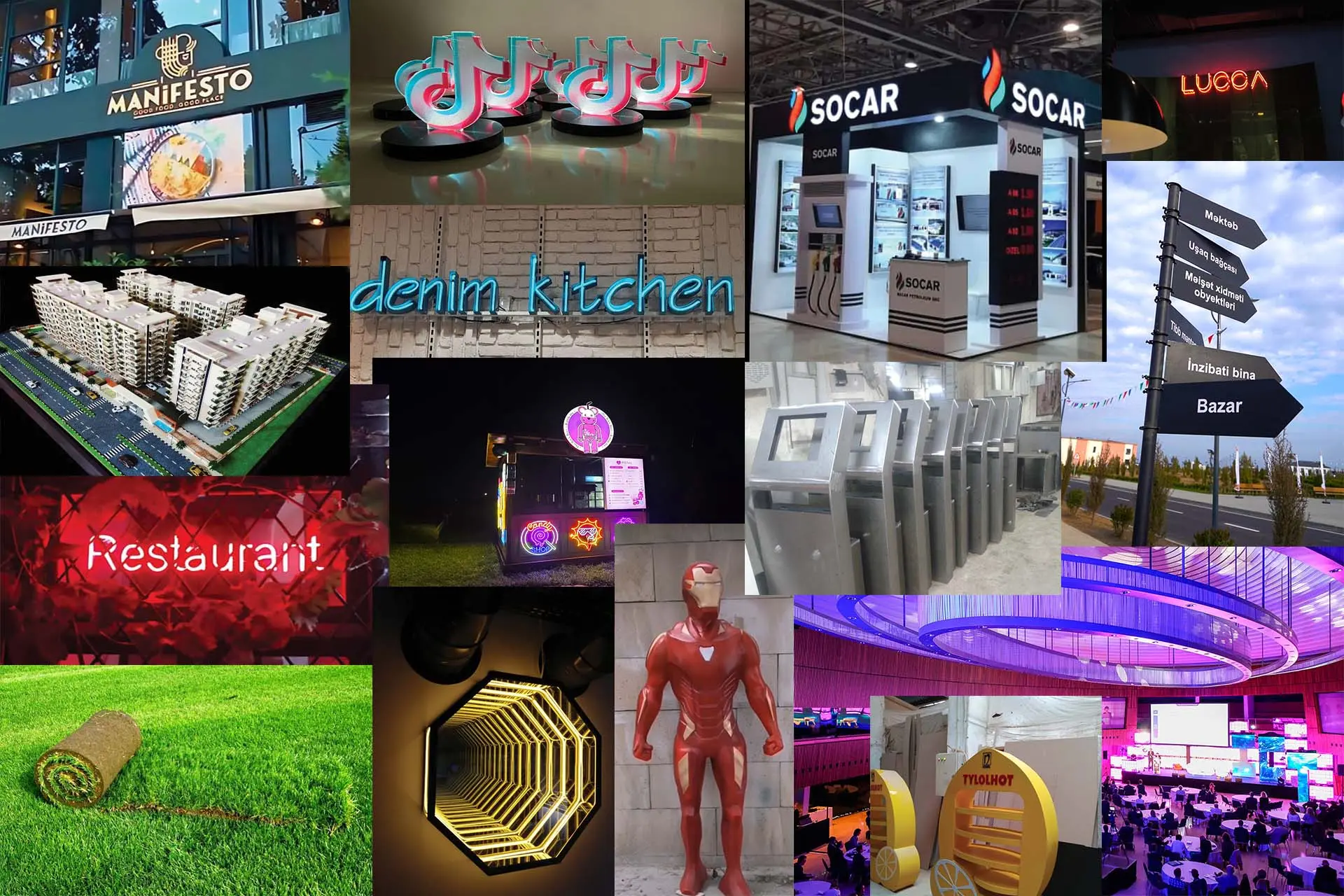 Metal konstruksiyalar, heykəllər, 3d modellər, ərazi maketləri, çöl və daxilireklam lövhələri, hərəkətli reklamlar, infinity mirrorlar, neon yazılar və sairə kimi məhsullar hazırlayırıq.
